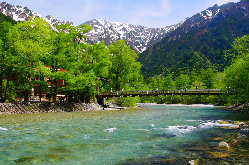 โดยฉากหลังของสะพานคัปปะ คือ เทือกเขาโฮตากะ หรือที่หลายคนเรียกว่า Japan Alps