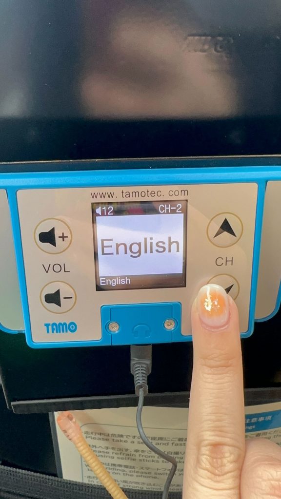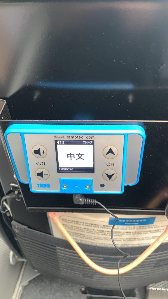 ก่อนขึ้นรถบัสจะได้รับหูฟังคนละอันเพื่อเอาไปเสียบเข้ากับอุปกรณ์ที่ที่นั่ง และสามารถฟังการบรรยาย